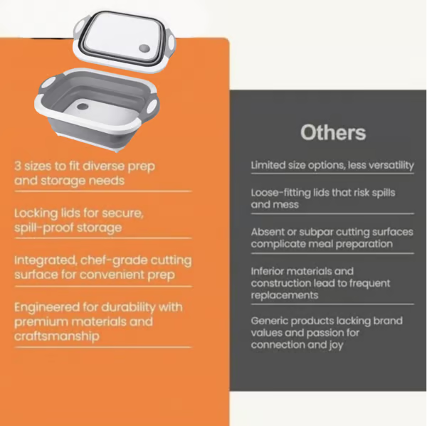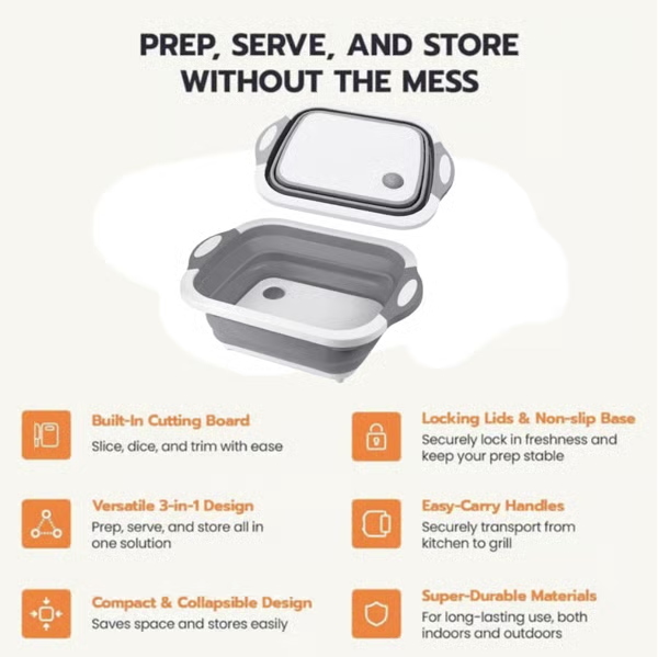 🧅 Prep, Serve & Store Without the Mess – Built-in cutting board and tight-seal lids keep your ingredients fresh and your counters clean.🧳 Compact & Easy to Carry – Collapsible body + secure handles = smooth transport from kitchen to grill.